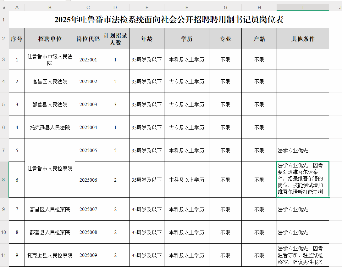 具体岗位条件详见《2025年吐鲁番市法检系统面向社会公开招聘聘用制书记员岗位表》(附件1)。