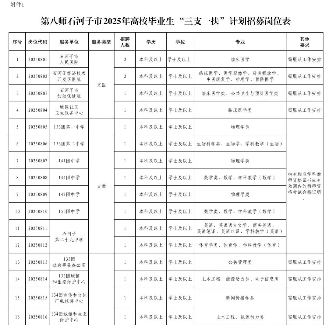 2025年第八师石河子市计划面向社会公开招募高校毕业生“三支一扶”人员45名(详见附件1)。