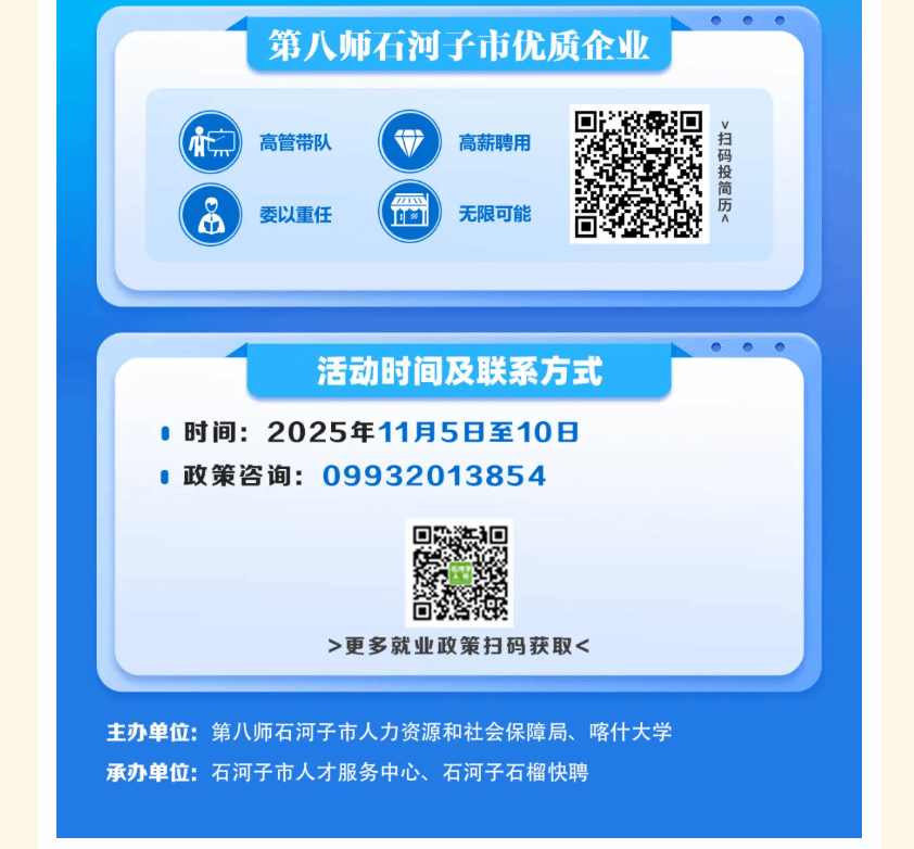 · 官方组织,名企云集:石河子人社局官方牵头,企业质量有保障,岗位真实可靠。